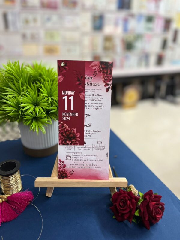 Crafted from durable 300 GSM thick board, the card measures 10.2 cm x 22.7 cm—compact, neat, and easy to handle. It features vibrant, full-color digital printing on both sides, finished with a smooth glossy coating that adds richness and visual appeal. Despite its premium look and feel, this card is affordably priced, making it a great option for large wedding guest lists.