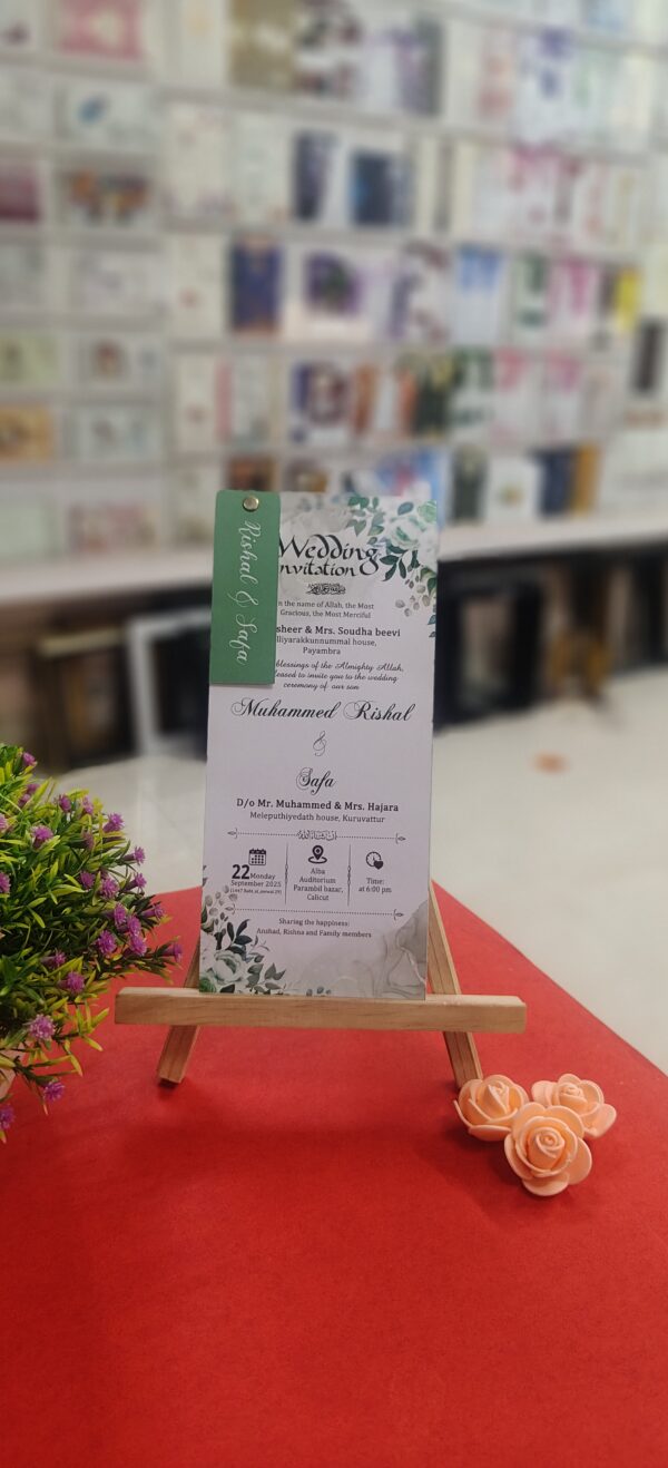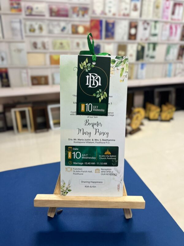 Crafted from durable 300 GSM thick board, the card measures 10.2 cm x 22.7 cm—compact, neat, and easy to handle. It features vibrant, full-color digital printing on both sides, finished with a smooth glossy coating that adds richness and visual appeal. Despite its premium look and feel, this card is affordably priced, making it a great option for large wedding guest lists.